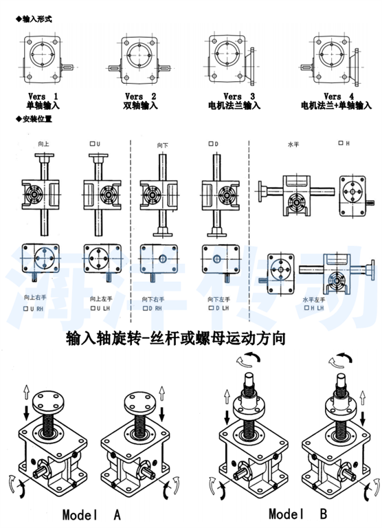 MA系列普通齒螺旋升降機 更適合重載應用:重負荷,高頻繁工作制 額定負載: 0.5噸 -35噸 推桿升降速度可至75mm/s 高輸入轉速: 3000rpm 工作制:30%(10分鐘運行3分鐘) 可選擇雙頭,三頭絲杠配套,參數咨詢我公司 附件:齒隙抵消裝置,防轉轉置,安全螺母,防塵罩,磁感應限位開關