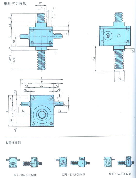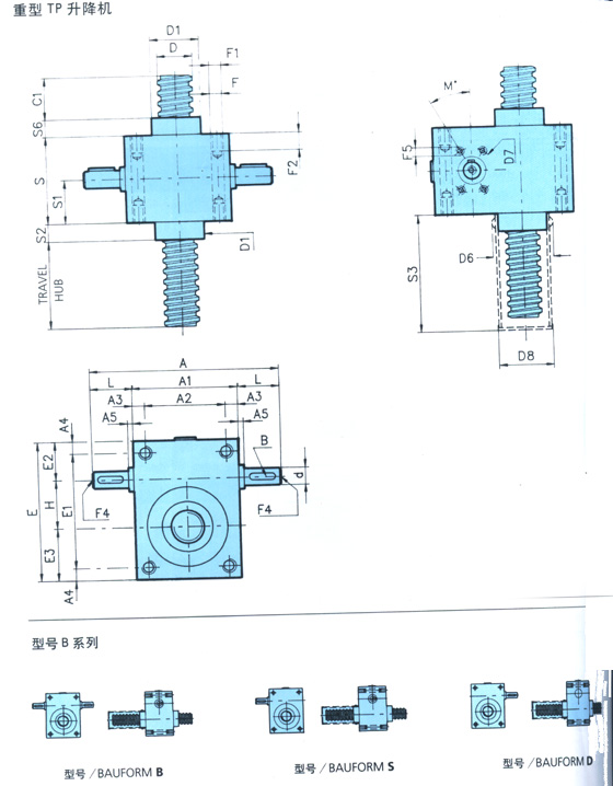 螺桿升降機(jī):TP軸向運(yùn)動(dòng)螺桿。驅(qū)動(dòng)軸旋轉(zhuǎn)帶動(dòng)蝸輪并產(chǎn)生螺桿的軸向直線運(yùn)動(dòng)。螺桿必須有抗旋轉(zhuǎn)功能;